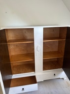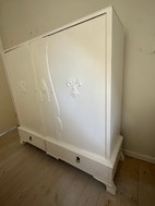 Flot , hvidt , gammelt garderobeskab i Fransk landstil med graveringer på skabsdørene . Har indvendigt 3 hylder og 2 skuffer forneden .