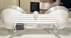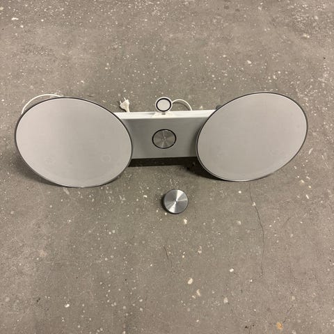 Bang & Olufsen Beoplay A8 højtaler i sort med to runde højttalere. Systemet har trådløs Wi-Fi-forbindelse og inkluderer fjernbetjening. Designet til brug i hjemmet med fokus på lydkvalitet og æstetik. Fremstillet i Danmark. Vægophæng, bordben, fjernbetjening samt Logitech Bluetooth Audio Adapter medfølger.