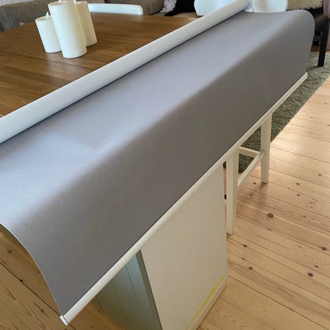 Luxaflex rullegardin i grå farve med kædetræk. Velegnet til montering på vinduer for at regulere lysindfald.