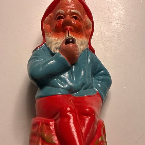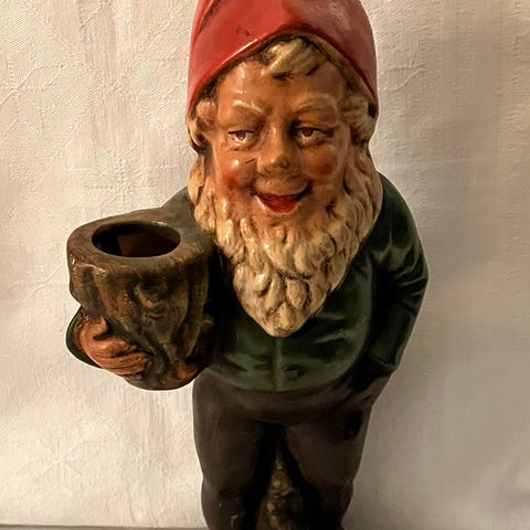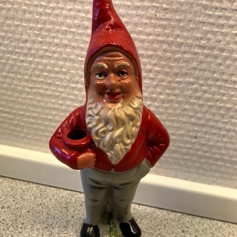 24 cm høj tysk nisse som står i "sneen". Super fin stand. Han er stemplet.