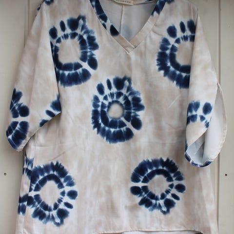 Brun bluse med v-hals og korte ærmer fra Allweek i blød polyester i str. L. Falder flot.