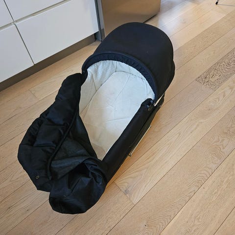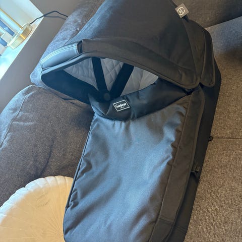 Emmaljunga barnevognsdel i gråt stof. Vognen har justerbar kaleche og polstret sæde med sikkerhedssele. Designet med fodstøtte og beskyttende frontbøjle. Ryglænet kan lænes langt tilbage, så barnet kan snuppe en lur i vognen. Klikkes på Emmaljunga-understel (medfølger ikke).