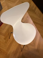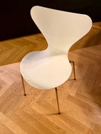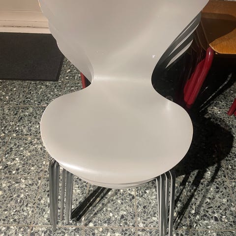 Syver stole i højglans hvid. Fast ryg og god stand. Dog med almindelige brugsspor. 6 stk sælges samlet. Pris pr. Stk.