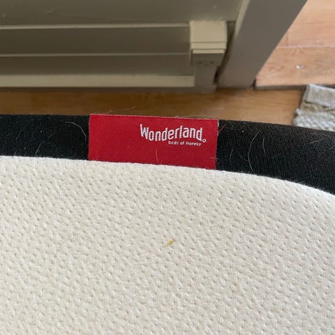 Sengen består af to boxmadrasser med sort betræk og en hvid topmadras ovenpå.