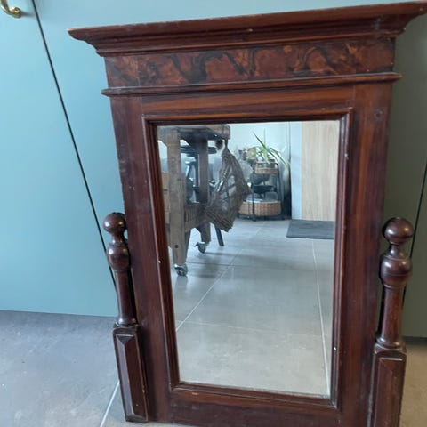 Smukt, antikt spejl i mahogni (tror jeg, eller nøddetræ?). Har hængt i en entré. Pladen bagpå skal have et par nye søm, øverst oppe. Og der mangler et stykke af dekorationen for oven.
