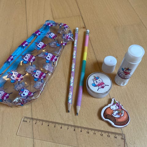inkl indhold: blyanter, viskelæder, lineal, vinkelmåler, saks, farveblyanter og tusser