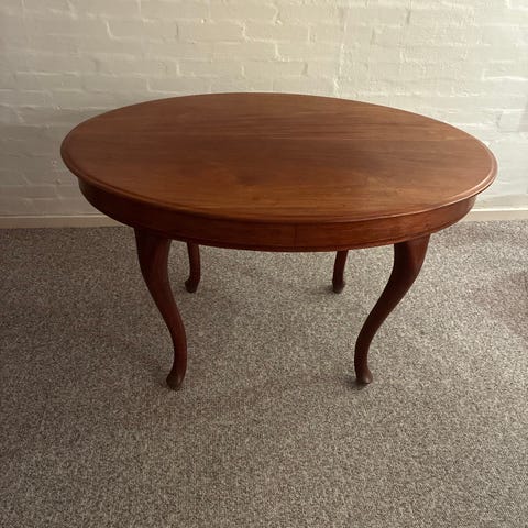 2 varmepletter, derfor skal det behandles. Ellers rigtig god stand. Kan trækkes ud og kommer med tilhørende plade for ekstra plads. 5 stole medfølger. 1 af stolene skal strammes ind.