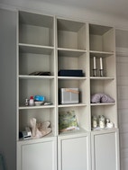 Fin reol i mdf træ i en beige/grå farve. Skal hentes på Vesterbro fra 4.sal. De er lette og det er tre seperat reoler, så burde være ligetil at transportere