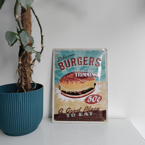 Steff Houlberg skilte med teksten 'Pølser & Burger'. Skiltet er rektangulært og har hvid baggrund med sort tekst og Steff Houlberg logo i farverne rød, blå og hvid. Skiltet kan anvendes til markedsføring eller dekoration ved madboder eller lignende.Eller til samlere