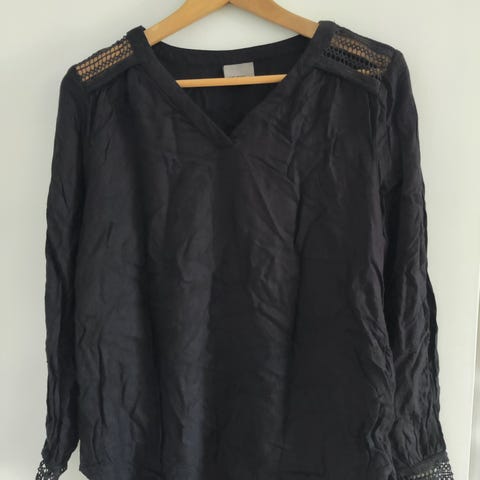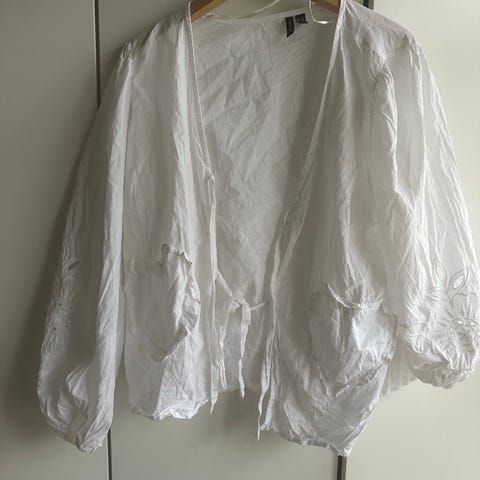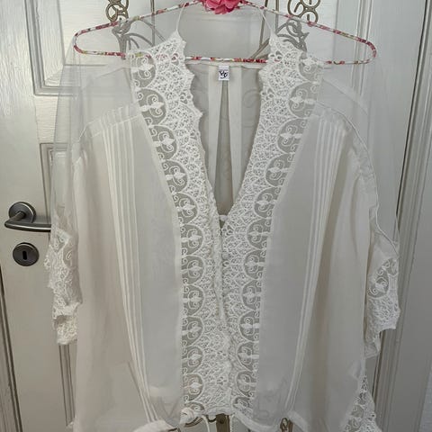 Ny ikke brugt. Hvid sød bluse med blonde forsn og ved ærmer og i kanten. Blød kvalitet. Str L