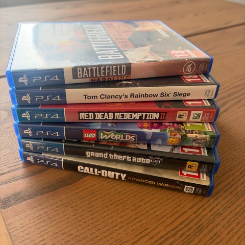 PlayStation 4 spilpakke bestående af syv spil: Rainbow Six Siege, Battlefield 1, Star Wars Battlefront II, Dying Light, Mortal Kombat XL, The Last of Us Remastered. Spil i original emballage med aldersmærkning og PlayStation 4 branding. Spilgenrer inkluderer action, skydespil, kamp og eventyr.