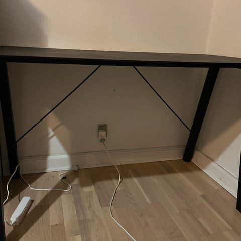 Fint kontorbord, der nemt har plads til en hjemmearbejdsstation med to skærme. Brugt, men i god stand