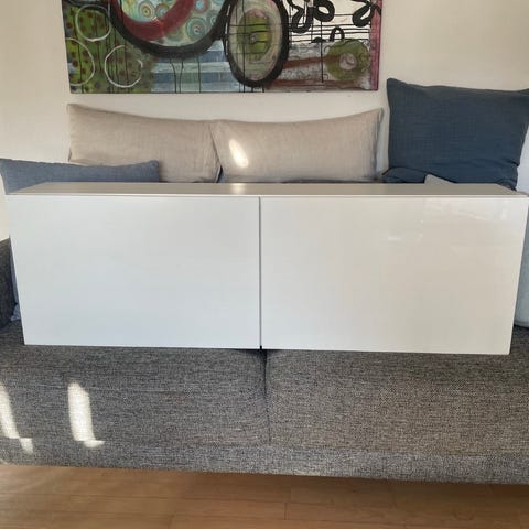 IKEA BESTÅ hængeskab med hvide højglanslåger.
