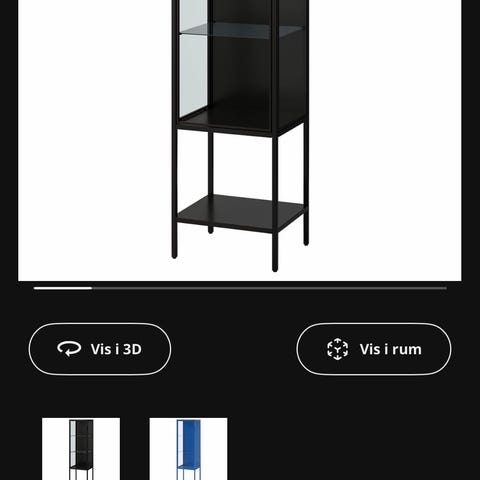 Sort Rudstra vetrineskab med 3 hylder. Sælges grundet flytning. Koster fra nyt i Ikea 999,-.