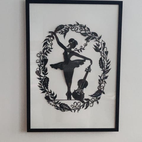Plakat som viser en illustrasjon av en fiolin med noter og håndskrevet tekst i sort og hvitt. Passer som dekorasjon i musikkrelaterte rom eller som kunstnerisk veggdekor.