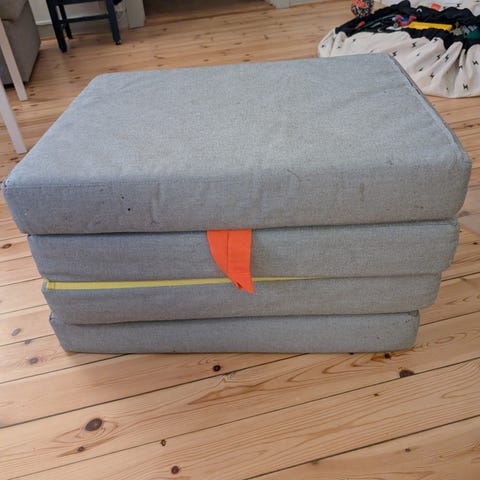 IKEA foldbar madrass i sort farve. Madrassen kan foldes i tre sektioner, hvilket gør den nem at opbevare og transportere. Den er velegnet til midlertidig overnatning eller som ekstra soveplads. Materialet er tekstil, og madrassen har en enkel og funktionel udformning.
