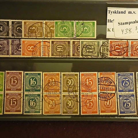 Tyskland Zoner (417) Planche med frimærker fra Engelsk/Amerikansk Zone og sjældne mærker fra den Franske Zone. Katalogværdien af disse mærker er 1.835,- kroner. Førprisen har været 200,-, men nu er den yderligere NEDSAT. Ud over de ovenfor nævnte mærker er der 2 postfriske mærker fra den Russiske Zone der tilsyneladende har en høj katalogværdi, men de er ikke talt med og følger bare oven i handelen.