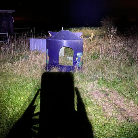 Solid og praktisk høklokke til får, større heste mv. Stor nok til at sætte en rundballe under. 8 huller. Muligt at løfte med krog men vejer ikke mere end den manuelt kan trilles og lægges over en hø- eller halmballe. Købt i 2021 hos P. Lindberg. Ø: ca 180, Højde ca 160.