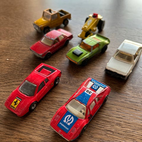 samling små legetøjsbiler i blandet stand, men de fleste kan køre. Der er blandt andet følgende mærker: matchbox, Gorgi, Majorette, Siku, Polytoys.