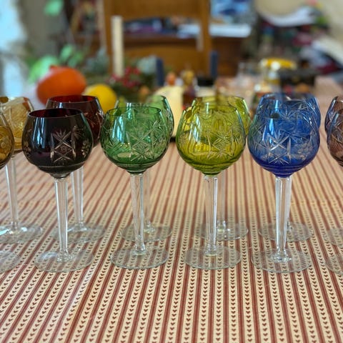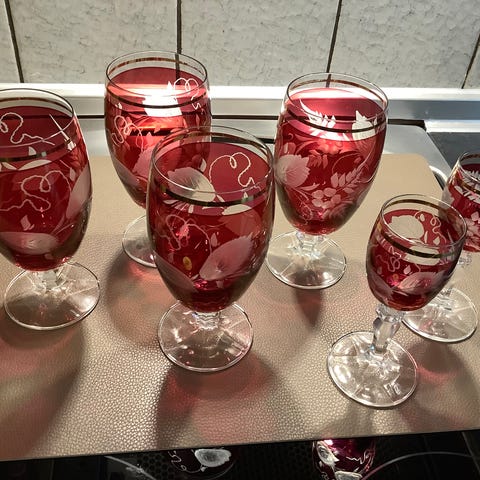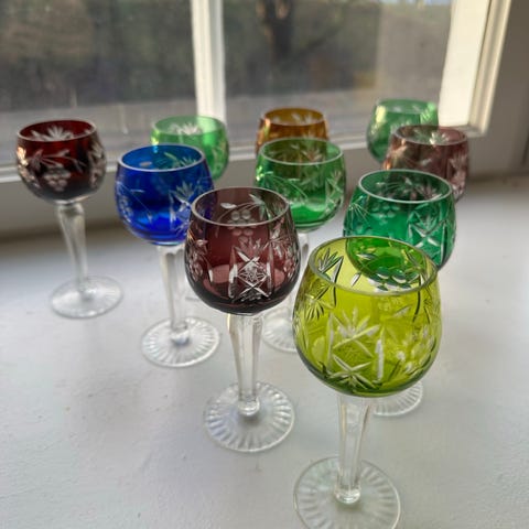 3 smukke böhmiske glas med små jagtscener sælges. Højde 7 cm. Aldrig brugt, kun stået til pynt. Ingen skår eller misfarvninger. Sælges samlet.
