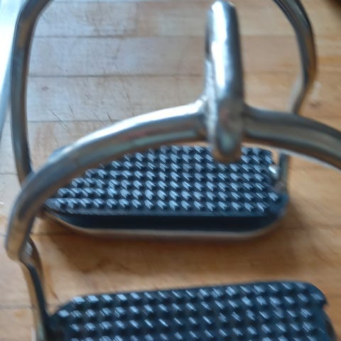 Jeg har disse letvægtsbøjler liggende, almindelig "damestørrelse", sælger ud af alt mit udstyr. Kun brugt enkelte gange på min lammeskindssadel, de fremstår pæne og fine. Jeg kan ikke huske mærket, og det står ikke på dem. De kostede 225 kr.