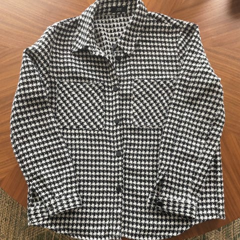 Grå damejakke i størrelse M. Jakken har en enkel og klassisk design med to lommer foran. Materialet er strikket og giver en blød og varm fornemmelse. Velegnet til hverdag og lettere brug.