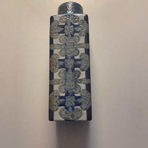 Royal Copenhagen Vase model 7720 3397 i keramik med brun glasur. Vasen har et unikt design med blå og brune detaljer. Produktet er håndlavet og har et mærke på bunden med serienummer og logo.