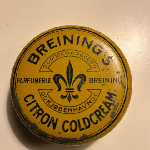 Etiket: Breinings Fougère Lotion med en koncentration på 30%, Tom original glasflaske med etiketten 'Breinings Lager København'. Flasken er placeret i en træholder med metalbånd.
