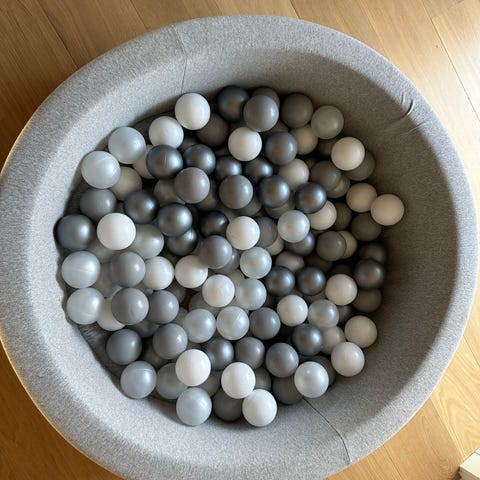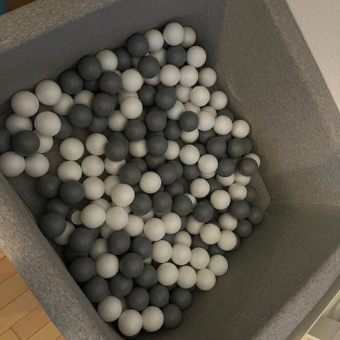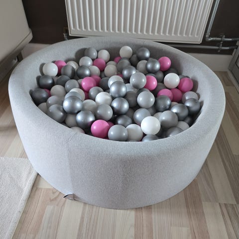 Jollyroom Børneboldbassin med farverige sider og mange plastikkugler. Bassinet er designet til børn og giver en sikker og sjov legeplads. Materialet er blødt og polstret for at sikre komfort og beskyttelse under leg.
