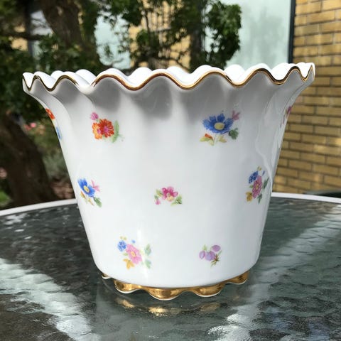 Porcelæn, urtepotte, Upsala Ekeby, Flot romantisk urtepotteskjuler med guldbelagt bølgekant og dekoreret med strø blomster. Måler 11,5 cm og har ø på 15. Fra Upsala Ekeby Karlskrona. Er i meget fin stand.