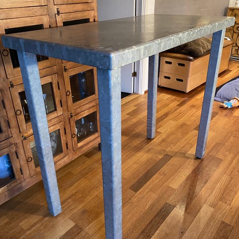 Rigtig fedt mødebord/højbord i lakeret krydsfinér med indbygget strømskinne. Måler 95 x 240 x 95 cm.