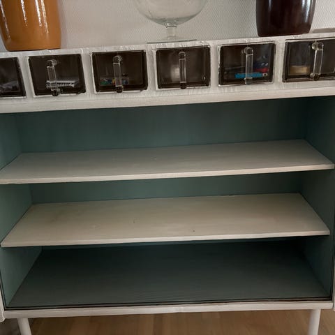 Gammelt antik køkkenskab med 2 glas skabe skuffe og 2 låger.