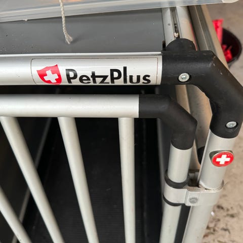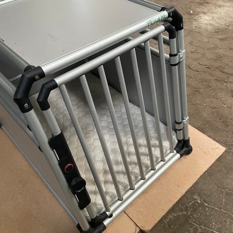 K9 proff. Transportbur lavet af metalramme og plastikpaneler. Burens dør kan åbnes, og det er designet til at sikre sikker transport af dyr eller genstande. Farven er sort med metalramme, og konstruktionen er robust og holdbar. mål 90cm x 81 x 70 ibunden. Helt nyt aldrig brugt . ny pris 3.500kr