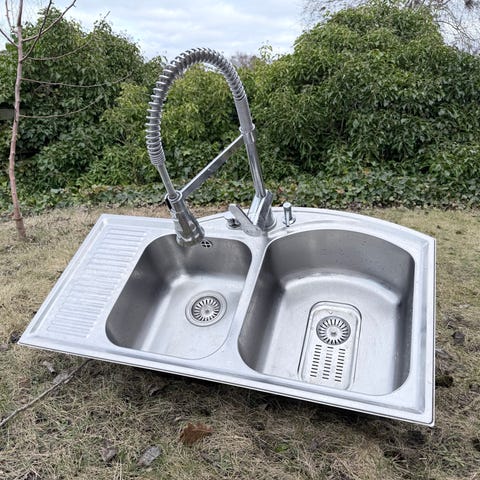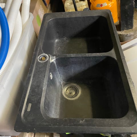 Juvel køkkenvask. Har aldrig været monteret. Afløbsdele mm, medfølger. Mål 70 x 40 cm stor vask 40 x 34 cm lille vask 24 x 34 cm.