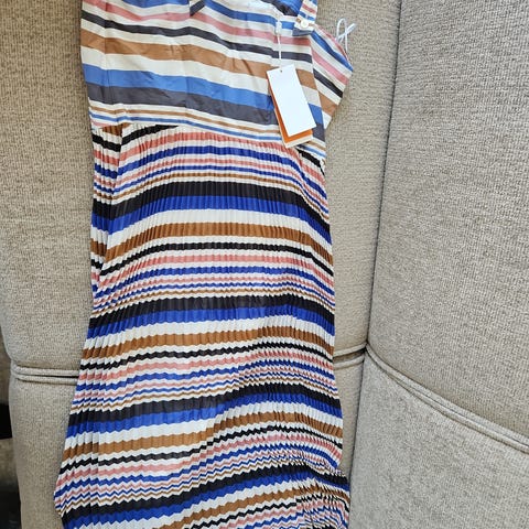 Hugo Boss Hverdagskjole i størrelse L, farven blå. Kjolen har korte ærmer med kontrastfarvede kanter og rund halsudskæring. Materialet fremstår som blødt og behageligt, egnet til hverdagsbrug for kvinder.