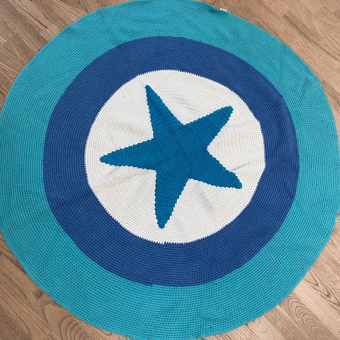Small Stuff rundt tæppe og pude sæt hæklet af bomuld i grå og hvide farver. Tæppet har en cirkulær form med et stjernemotiv i midten. Puden matcher tæppets design og materiale. Sættet kan anvendes som gulvdekoration eller til afslapning.