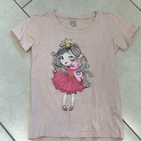 Pink bomulds t-shirt fra Angel's face str 128. Den har læse ærmer og vinger på ryggen. Jeg har også nummeret større i lyserød - den har desværre fået et lille bitte hul, så den følger med, hvis du vil have den.