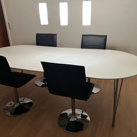 Spisebord m tillægsplade, med 4 stole