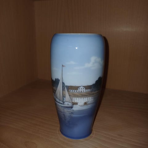 Royal Copenhagen Blåkant Vase og Skål Porcelæn Sejlskib Motiv