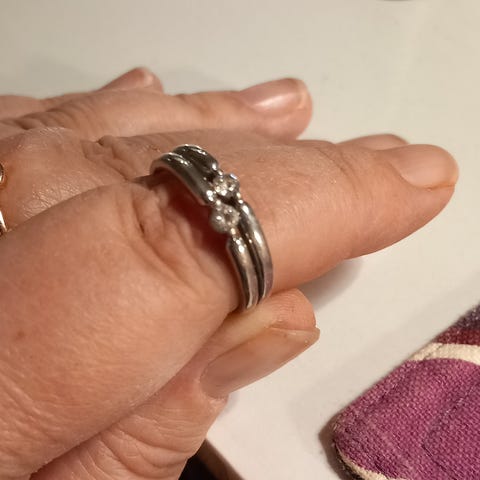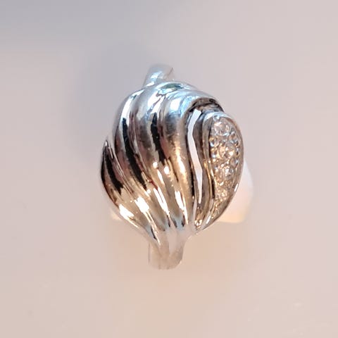 En sølvring med små hvide sten. Sandsynligvis zirkoner.