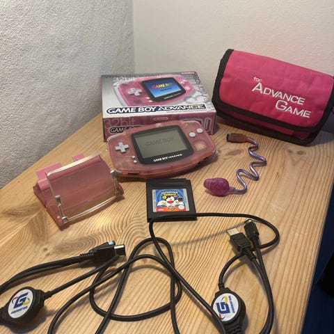 Nintendo Game Boy Advance håndholdt spilkonsol i transparent plastik. Konsollen anvender AA-batterier og har en farveskærm. Medfølger flere spilkassetter, herunder titler fra Pokémon-serien og andre klassiske spil. Konsollen er velegnet til spilentusiaster og samlere.