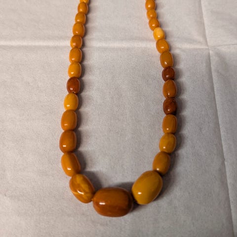 Ravhalskæde sammensat af polerede perler af mælkerav