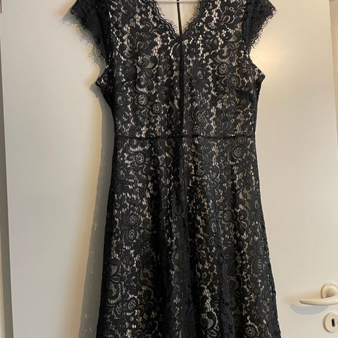 Smuk knælang blondekjole. Kjolen har opretstående krave og åbning bagpå med knapper i nakken. Str. Small. Kun brugt en gang