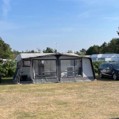 Brugt fortelt i blå farver og rigtig fin stand årgang 2016, med fiberstænger (Carbon X) og hvide gardiner.
