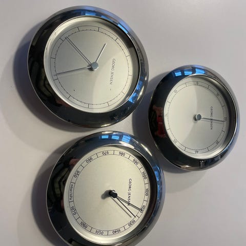 Georg Jensen, vejrstation, barometer, hygrometer, ur, design, dansk design, sølv look, rustfrit stål, designklassiker, boligindretning, kontordesign, luksus interiør, moderne retro, vægur sæt, Georg Jensen vejrstation