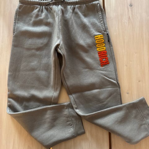 Hoodrich joggingbukser i sorte med blå skrift langs benet.