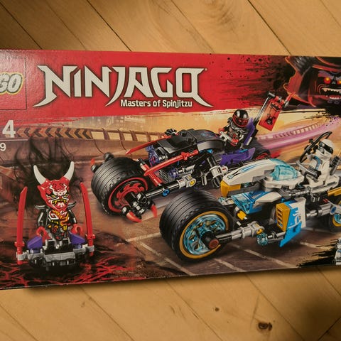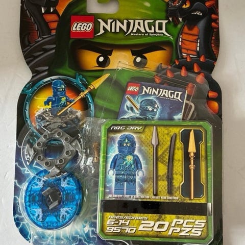 Indeholder figurer og tilbehør, herunder en rød drage og minifigurer med våben.