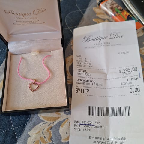 Den med dobbelt hjerte er 9 karat og har været i brug få gange, står som ny