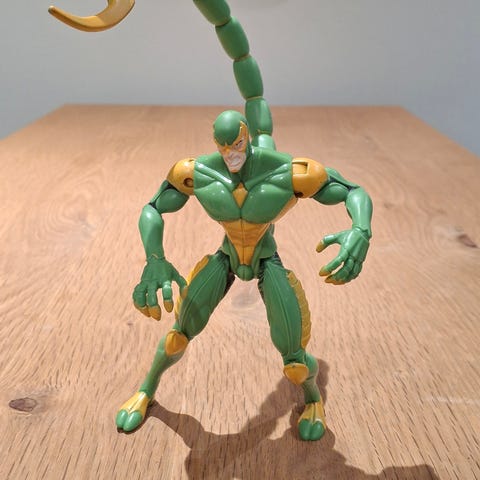 Super cool Stor vintage Toybiz Marvel Spiderman Scorpion Try slayer fra 1994 måler 26-27 lang x 20 høj med halen . Kr 50,- se flere fotos på annoncen og mine andre retro vintage annoncer og samlerobjekter og evt mængde rabatter på de ting jeg kan. Sender gerne