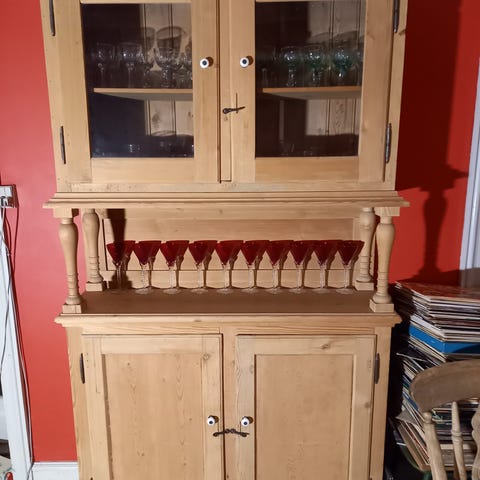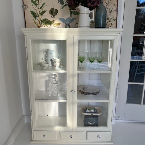 Flot, rummeligt gammelt vitrineskab, afsyret og derfor lige til at male, hvis man har lyst til at give det en farve. De to skuffer er dybe og giver skabet et klassisk køkkenlook. Pris 2300 kr - prisen er mindsteprisen
